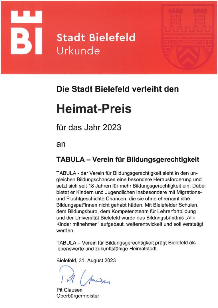 Die Stadt Bielefeld verleiht den Heimatpreis 2023 an TABULA – Verein für Bildungsgerechtigkeit